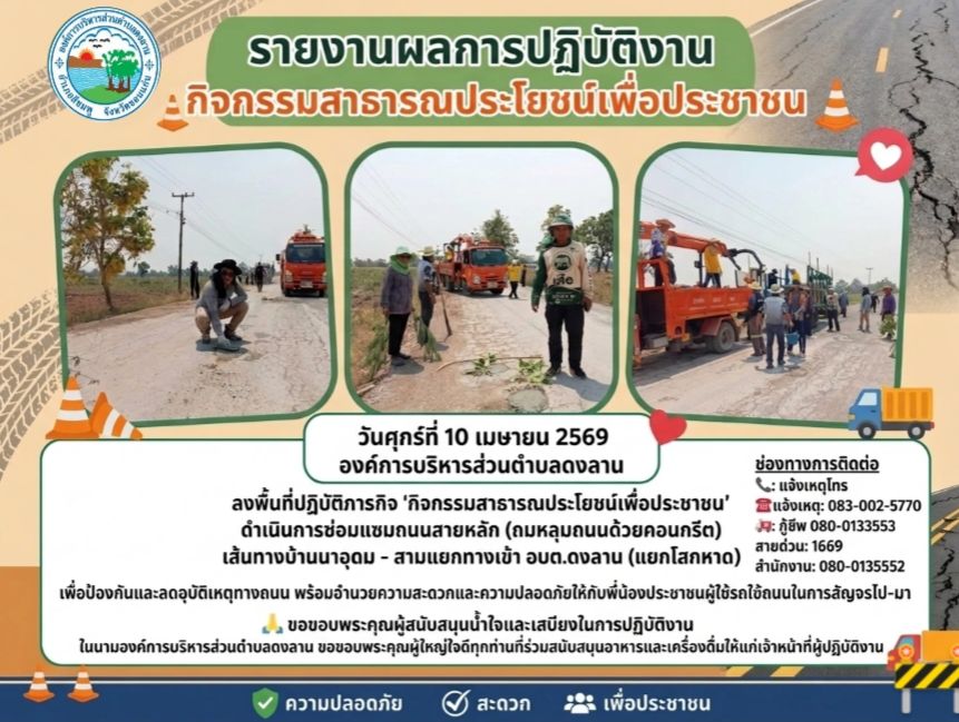"กิจกรรมสาธารณประโยชน์เพื่อประชาชน" ดำเนินการซ่อมแซมถนนสายหลัก (ถมหลุมถนนด้วยคอนกรีต) เส้นทางบ้านนาอุดม - สามแยกทางเข้า อบต.ดงลาน (แยกโสกหาด) ประจำปีงบประมาณ 2569